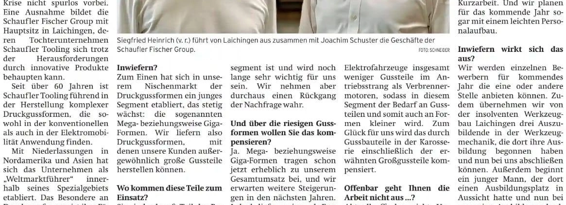 Die Schwäbische Zeitung berichtet in ihrer Ausgabe vom 22. Oktober 2025 über die erfolgreiche Entwicklung der Schaufler Fischer Group in herausfordernden Zeiten der Automobilbranche. Trotz der anhaltenden Marktveränderungen behauptet sich unser Unternehmen mit Innovationskraft, Stabilität und zukunftsorientierten Lösungen.