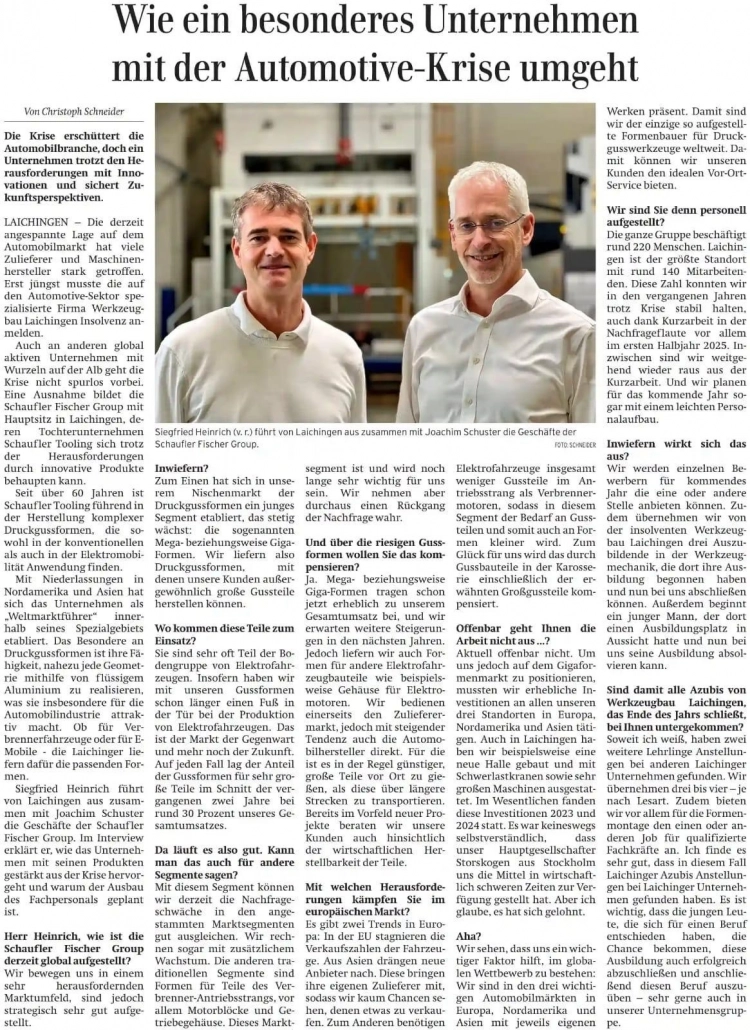 Die Schwäbische Zeitung berichtet in ihrer Ausgabe vom 22. Oktober 2025 über die erfolgreiche Entwicklung der Schaufler Fischer Group in herausfordernden Zeiten der Automobilbranche. Trotz der anhaltenden Marktveränderungen behauptet sich unser Unternehmen mit Innovationskraft, Stabilität und zukunftsorientierten Lösungen.